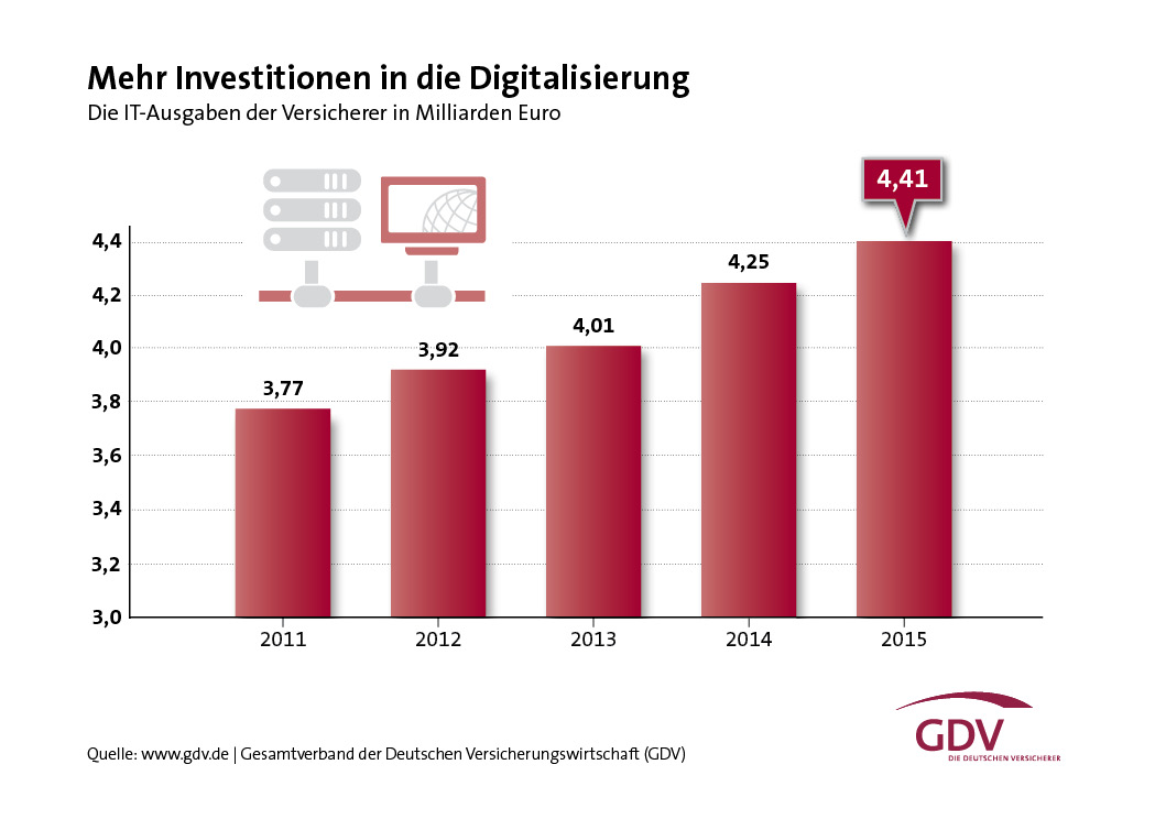 Die deutschen Versicherer haben 2015 die Investitionen in ihre IT-Systeme erneut gesteigert. Die Unternehmen gaben mit rund 4,41 Milliarden Euro etwa 3,8 Prozent mehr für ihre digitale Infrastruktur aus als ein Jahr zuvor. Das geht aus der aktuellen Erhebung des Gesamtverbandes der Deutschen Versicherungswirtschaft (GDV) hervor. „Der Anstieg der Investitionen unterstreicht den hohen Stellenwert, den die Digitalisierung für die Unternehmen hat“, sagt der Vorsitzende der GDV-Geschäftsführung Jörg von Fürstenwerth.