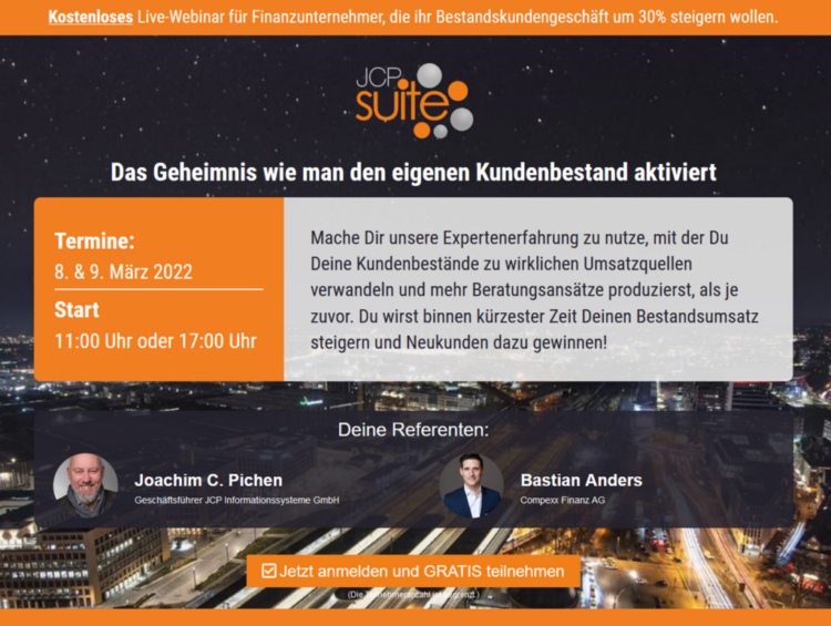 LIVE-WEBINAR – Mit der JCP Beratungssoftware bis zu 30 % Mehrumsatz im Bestandkundengeschäft?!