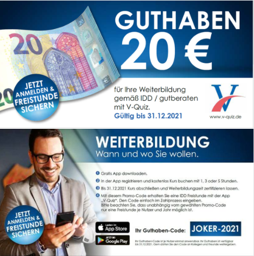 V-Quiz ist in den Ländern Schweiz, Deutschland und Österreich von den jeweiligen Akkreditierungsinstituten (Cicero, gutberaten.de und ibw) akkreditiert und damit berechtigt Weiterbildungsstunden gemäß IDD zu vergeben