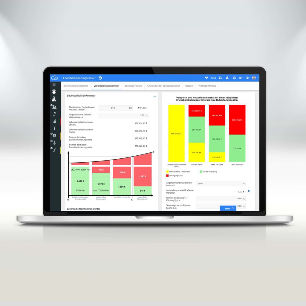 Basis des Beratungsansatzes ist das aktuelle Erwerbseinkommen Ihres Kunden. Nach Abzug von Steuern und Sozialversicherungsbeiträgen bildet das Nettoeinkommen den individuellen Bedarf. Gegen diesen Bedarf halten wir die gesetzliche Versorgung bei längerer Krankheit, Erwerbsminderung/Berufsunfähigkeit, Berufs- und Freizeitunfall, ambulanter/stationärer Pflegebedürftigkeit sowie der Hinterbliebenenversorgung. Wer diese Analyse schnell, zuverlässig und leicht verständlich bieten kann, ist der Schließung der Versorgungslücken viele Schritte näher als die Konkurrenz.