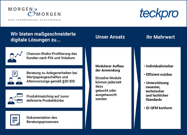 Das unabhängige Analysehaus MORGEN & MORGEN bietet zusammen mit teckpro maßgeschneiderte digitale Lösungen zum Branchenthema IDD. Der sogenannte „IDD Profiler“ bietet Maklern, Vertrieben und Versicherern Unterstützung bei Beratungsprozessen inklusive Angemessenheits- und Geeignetheitsprüfung.