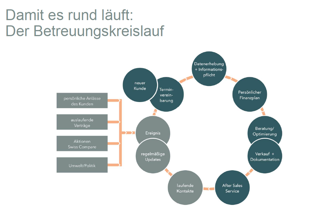 In der folgenden Grafik ist der sogenannte „Beratungskreislauf“ abgebildet, ein lebensbegleitendes System für Kunde und Vermittler. Dieses stellt sicher, dass Sie keine Anlässe für Betreuung und Beratung verpassen.