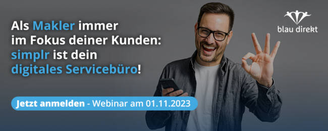 Die B2B2C- Kunden-App simplr verzeichnet über 300.000 Downloads und ist dein neues digitales Servicebüro mit der du eine erhebliche Arbeitsersparnis erreichst: Durch die Echtzeit-Synchronisierung mit dem MVP Ameise von blau direkt bietet sie deinen Kundinnen und Kunden jederzeit einen exakten Überblick über bestehende Verträge. 24 Stunden am Tag – 7 Tage die Woche – Dabei bist du als Makler:in immer als Ansprechpartner:in im Mittelpunkt und pflegst so ganz nebenbei deine Kundenbeziehung.